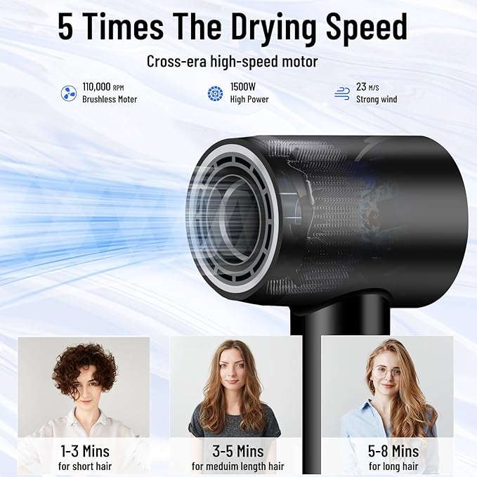 Achieve salon-quality results in minutes with this next-generation high-speed hair dryer. Featuring a powerful 110,000 RPM brushless motor, this dryer delivers ultra-fast drying while protecting hair health with negative ionic technology that reduces frizz and enhances shine.